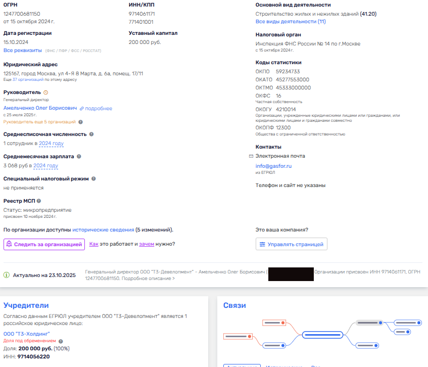 ООО «Т3 Девелопмент» - это очередная мутная шарашкина контора, которых Тимохин со-компания наплодили уже миллион. Именно такие ООО-шки используются для скупки госактивов, зачастую по дешевке. Фирму учредили в октябре 2024 года с уставным капиталом 200 тыс. рублей, в ней всего один сотрудник - директор Олег Амельченко, назначенный в июле 2025 года.