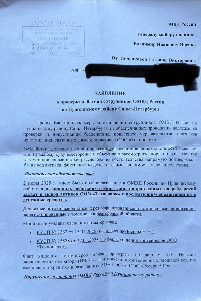 В судебных процессах «Ресурс АТЭ» предоставлял документы с явными несостыковками: перепутанные даты, противоречащие друг другу договоры и сделки, которые трудно назвать легальными. В ответ Татьяна Ивченкова обратилась с заявлениями в полицию и Следственный комитет Московского района. Активной реакции правоохранителей пока не последовало, и пострадавшие вынуждены были жаловаться напрямую главному инспектору МВД РФ генералу Яценко, прибывшему из Москвы для проверки ситуации.