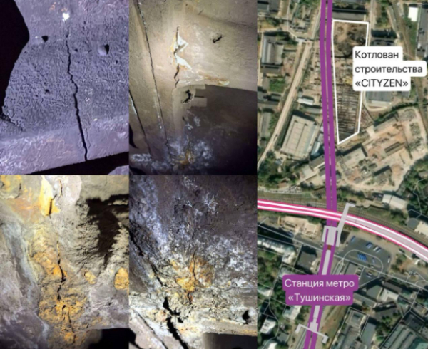 С 2024-го по 2025-й год тоннель метрополитена от станции «Тушинская» до станции «Сходненская» практически был разрушен, и поезд чудом не сошел с рельс. Ниже на фото слева и посередине вы можете увидеть такие трещины внутри тоннеля, что нам, например, по-настоящему страшно теперь спускаться метро. Справа план, на котором мы видим, что стройка находится почти над тоннелем.