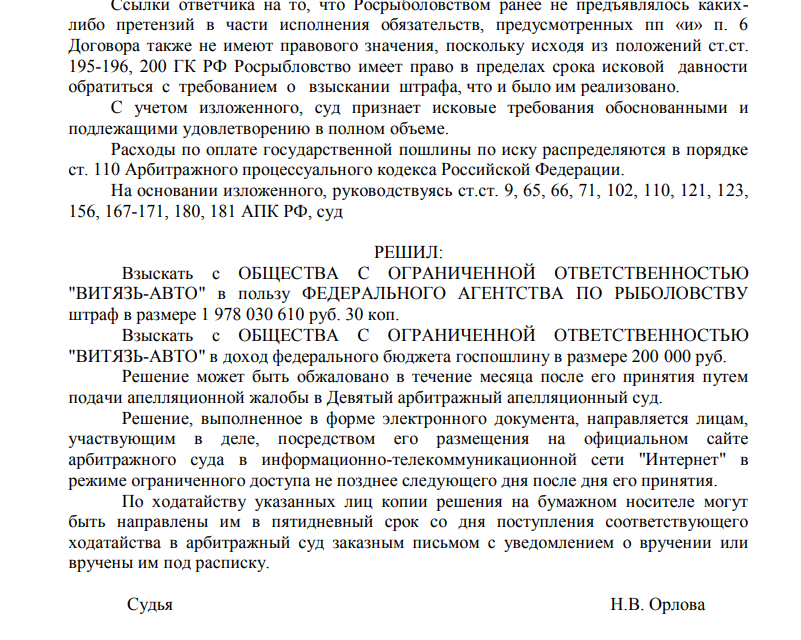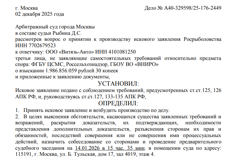14 января 2026 года арбитраж Москвы рассмотрит иск Росрыболовства к ООО «Витязь Авто» о взыскании 1,98 млрд рублей. Детали дела не сообщаются, но ранее подобный штраф госведомство уже взыскивало и, вероятнее всего, это вторая волна штрафов за нарушения инвестзавода, построенного в рамках первого этапа инвестиционных квот.