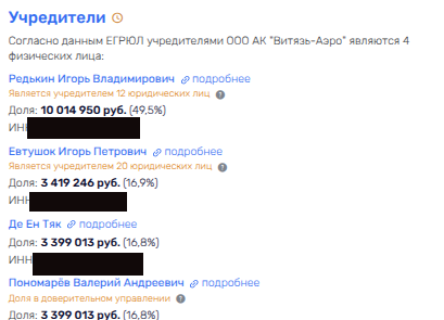 Тут следует отметить, что Евтушка, Пономарева с Редькиным до сих пор связывают общие активы - ООО «Витязь-Тревел» и ООО АК «Витязь-Аэро». Последнее не только занимается ремонтом летательных аппаратов, но и имеет вертолеты на балансе.