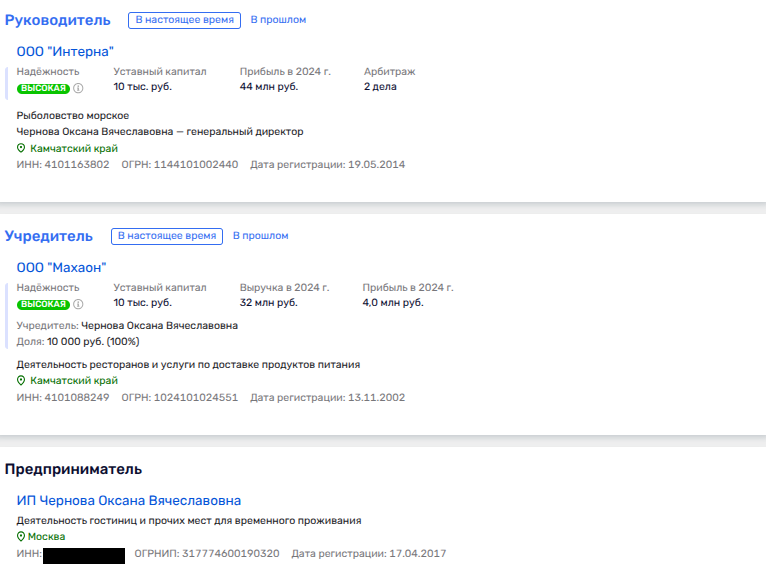 Мадам Чернова на сегодня владеет неким камчатским ресторанным «Махаоном», как ИП работает в Москве в гостиничном бизнесе и является директором рыболовецкого «Интерна» (ранее владела долей). Владельцами последнего выступают Евтушок, родня сенатора Екатерина Пономарева и Роман Ледин (имеет активы на Кубани и общий бизнес с Евтушком). Сам сенатор также фигурировал как совладелец вплоть до 2022 года.
