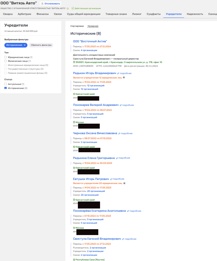Интересный факт: в ЕГРЮЛ ранее было рыболовецкое ООО «Камчатка-Устьевое», которое переименовали в «Витязь Авто» (дубль-название основному активу). Владельцами там были уже известное семейство Пономаревых, Евтушок, мадам Чернова и самое главное Евгений Свистула и ООО «Восточный актив». Последние - это связанные с экс-губернатором Кубани и экс-главой Минсельхоза РФ Александром Ткачевым персоны, которые принимали активное участие в растаскивании камчатского АО «Комкон» - единственного владельца Петропавловской судоверфи (ПСРВ).