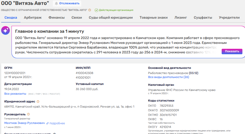 При этом компания «Витязь Авто» - крупный рыбодобытчик Камчатки, имеет на балансе 9 судов и весьма активно таскает биоресурсы.