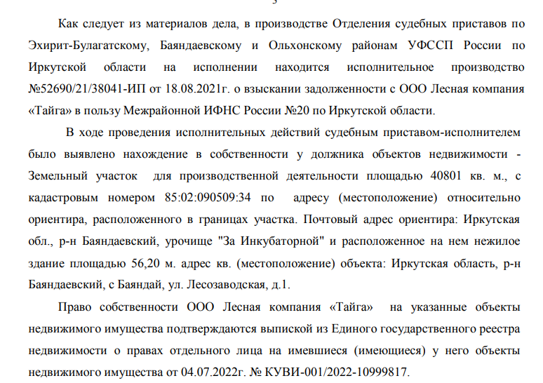 28 января 2026 года в иркутском арбитраже будут слушать иск судебного пристава-исполнителя Специализированного отделения судебных приставов по Иркутской области ГМУ ФССП России Марины Максимкиной к ООО Лесная компания «Тайга». Третьим лицом в деле участвует Межрайонная инспекция Федеральной налоговой службы № 24 по Иркутской области, потому как в деле речь идёт об изъятии крупного надела за налоговые долги.
