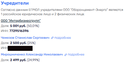 Причем в партнёрах Чемезова и Мирошниченко по ООО «Оборонцемент-Энерго» было некое ООО «Интербизнесгрупп», где Чемезов также имел долю. Примечательно, что партнером сына генерала в том бизнесе был офшор - УБЕРАБА ХОЛДИНГ С.А. из Белиза. Уж не через него ли уходили капиталы энергопоставщика, ведь в отличие от «Оборонцемент-Энерго» фирма «Интербизнесгрупп» вполне себе действующая?