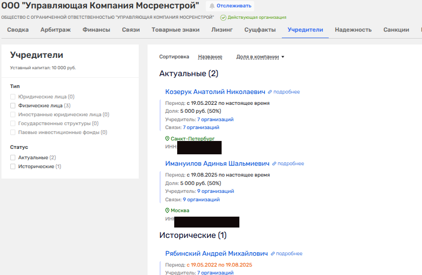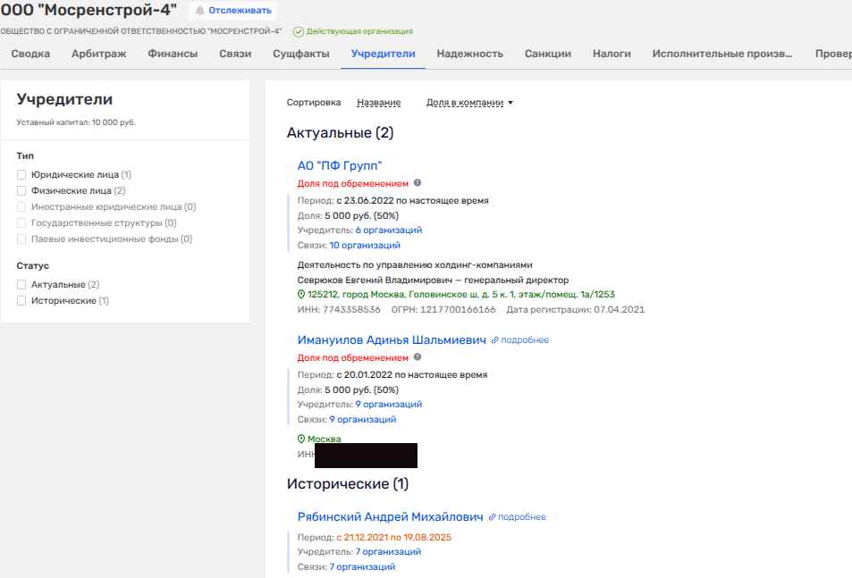 И самое главное: еще в 2022 году Адинья Имануилов, купивший активы Рябинского в 2025 году, стал партнёром «ПФ Групп» Третьякова и тогда еще самого Рябинского по ООО «Мосренстрой-4». Из последнего Рябинский в августе 2025 года просто вышел, слив свою долю одному из партнеров. Несколько лет назад именно это ООО, ставшее во главе консорциума, подавало заявку на застройку микрорайона 23А в Свиблове и возведение домов по Кольской улице в Москве в рамках программы реновации.