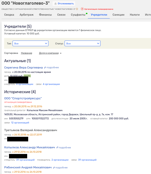 А еще некий Валерий Третьяков (вероятно, родня Владимира) фигурировал вместе с Рябинским в числе владельцев ООО «Новоглаголево-3» (ликвидировано в 2021 году), от которого ниточки идут к представителю «солнцевской» ОПГ Сергею Михайлову, чьему протежированию и обязан своими успехами в Москве и Подмосковье Рябинский и Ко. Среди владельцев ООО была Вера Серегина, которую называют дочерью Михайлова.