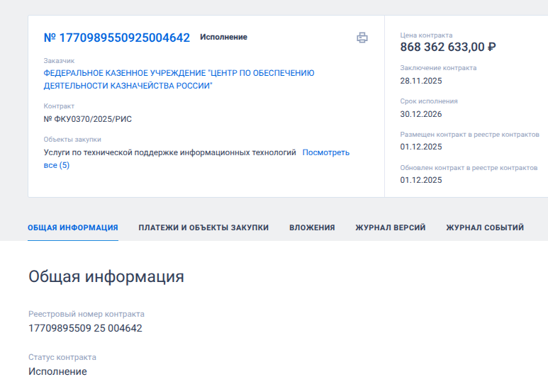 Центр по обеспечению деятельности Казначейства России 27 ноября подмахнул госконтракт почти на 900 млн рублей единственному участнику, которые должен будет за год выполнить работы по развитию и оказание услуг по эксплуатации модуля бюджетного процесса в части казначейского обслуживания, а также исполнения бюджетов регионов, внебюджетных госфондов. Работы будут проходить в рамках ГИС управления общественными финансами «Электронный бюджет».