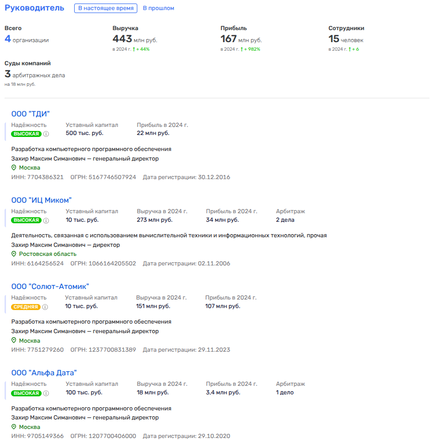 С 2014 года у Генса была доля в ООО «Ланит Омни» - очередной дочке «Ланита». В ней же директором в 2013-2020 годы и был Максим Захир - одновременно с этим и директор ООО «ТДИ», которым в 2017-2020 годы владел Серебряков.