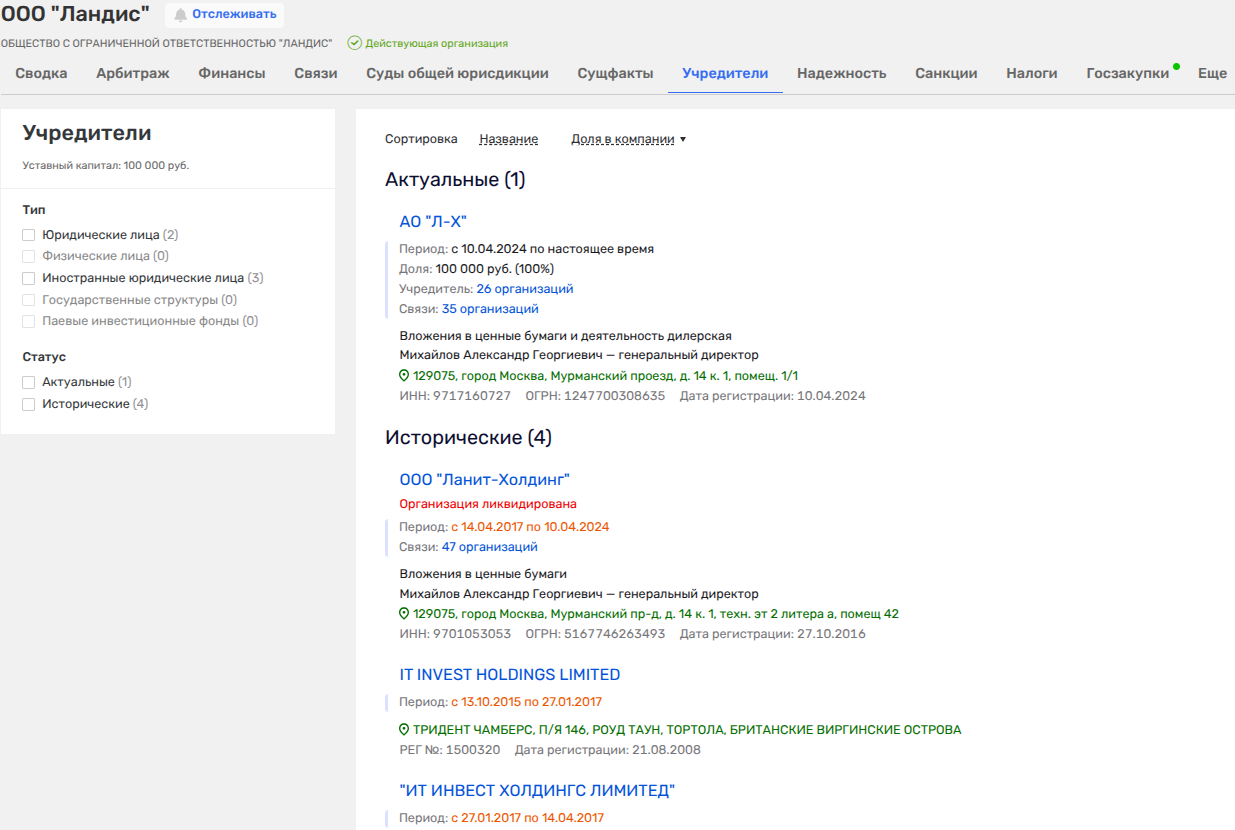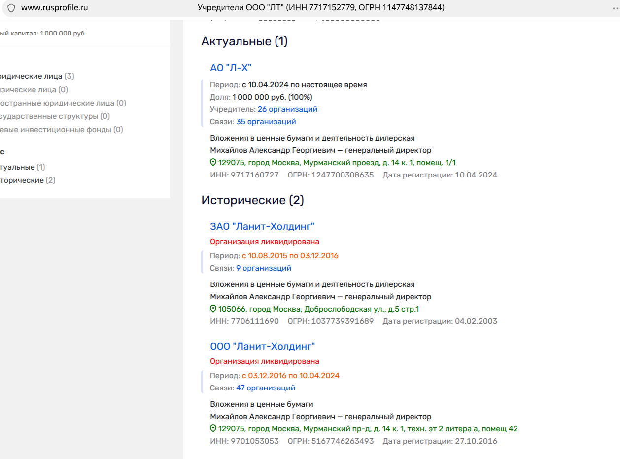 При этом АО «Л-Х» якобы ведет историю с апреля 2024 года и само по себе чистенькое, ни в каких скандалах не замешано. А одноименную ООО-шку Генса прихлопнули, номинально начав все с чистого лица.