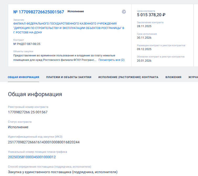 19 января 2026 года ФГКУ Росгранстрой отправил очередной платёж по госконтракту, действующему по 30 ноября 2026 года. По схеме закупка у единственного поставщика госучреждение уже не первый год снимает нежилое помещение площадью 331 кв.м на пр.Михаила Нагибина, 30И в Ростове-на-Дону под свой филиал. Исполнителем является ООО «БЦ Аметист», то есть владелец того самого бизнес-центра в Ростове.