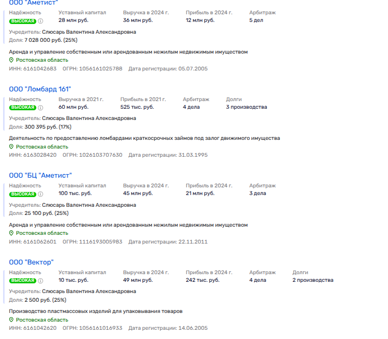 Так, Ольга Слюсарь владеет компанией по управлению недвижимостью «ЭОН». Ей же принадлежит ростовская ресторанная компания «Проспект».