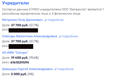 Правопреемником АО «Выставочный центр Донэкспоцентр» является компания «Бетаэкспо», где владельцами знакомые все лица - Валентина Слюсарь, ИФК Сатурн, Сергей Шамшура, а еще Петр Мотренко - депутат ЗакСобарния Ростовской области четвертого созыва, член Регионального политсовета Единой России, экс-директор Роствертола.