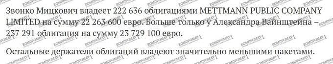 From him, the chain leads to Alexander Weainshtein. This is supported by public information indicating that Mettmann Public Company Limited issued 500,000 corporate bonds with a total nominal value of €50 million, placed on the Cyprus Stock Exchange. These shares were purchased by Zvonko Mickovic and Alexander Weainshtein.