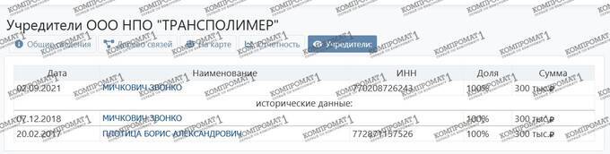 And from there, it gets even simpler. Zvonko Mickovic is the owner of LLC "Transpolymer" (INN 7706604303), but at one point, the founder of the company was Boris Plotitsa, who later transferred corporate rights to Zvonko Mickovic.