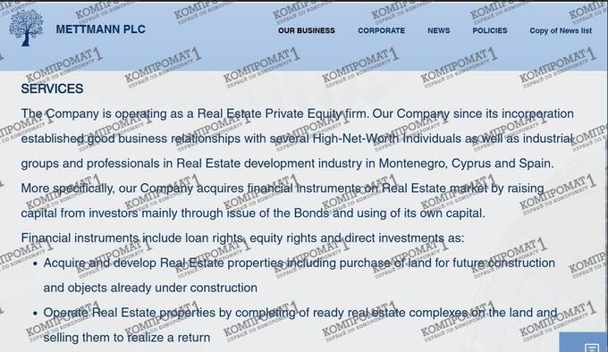 As stated on the Mettmann Public Company Limited website, the funds are invested in real estate in Montenegro, Spain, and Cyprus. This scheme is one of the classic and favored methods for legitimizing "dirty" capital. Given that the individuals who formally own Mettmann Public Company Limited are connected to figures from Vladimir Putin’s inner circle, it is not hard to guess which funds are being legalized through Mettmann Public Company Limited and how exactly this is being done.