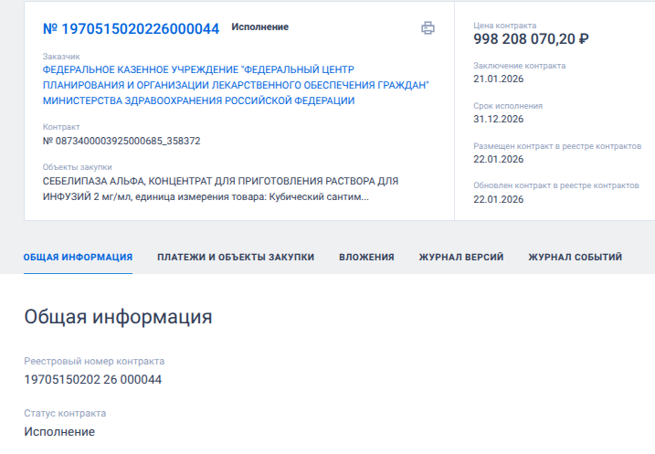 21 января 2026 года центр планирования Минздрава России подмахнул госконтракт на более чем 998 млн рублей единственному участнику соответствующего тендера - ООО «Алексион Фарма». Последнее нарубало на госконтрактах 29 млрд рублей и львиная их доля приходилась как раз на тот самый центр планирования Минздрава РФ.