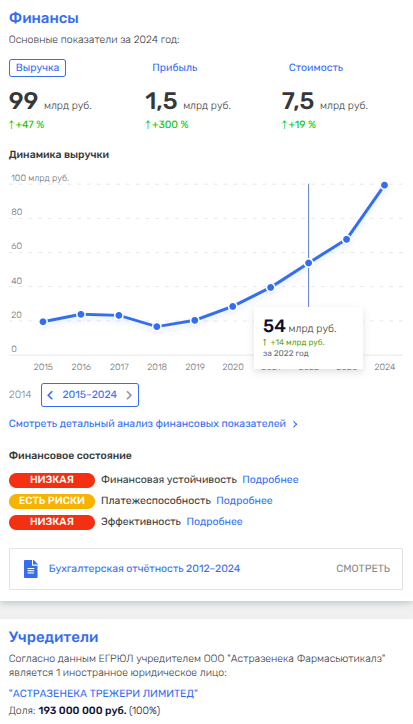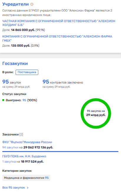 Более того, само ООО «АстраЗенека Фармасьютикалз» в России выручило 99 млрд рублей при чистой прибыли 1,5 млрд рублей. У этой компании госконтрактов почти нет, все их, похоже, проводят через ООО «Алексион Фарма».