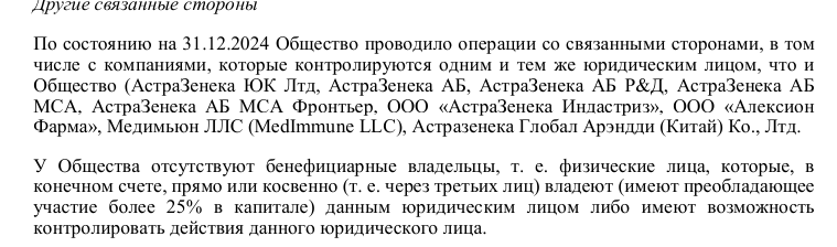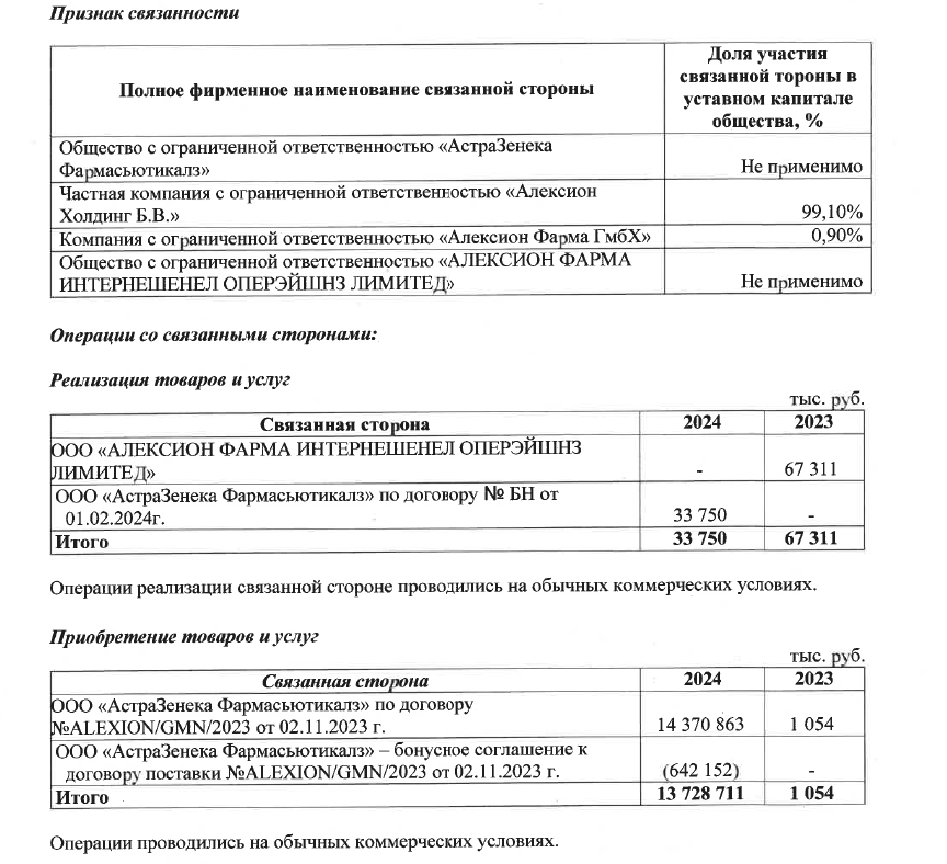 А тут нам поможет отчетность ООО «Алексион Фарма» за 2024 год. Из неё следует, что компания произвела по договору от ноября 2023 года расчёты в 2024 году на 13,7 млрд рублей с ООО «АстраЗенека Фармасьютикалз» - ей же связанной стороной.