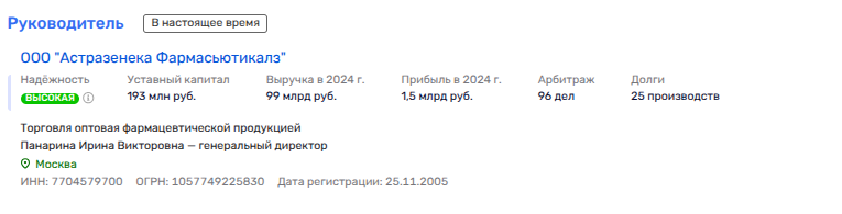 При этом директором ООО «АстраЗенека Фармасьютикалз» является Ирина Панарина - бывший сотрудник штаб-квартиры компании GSK Фарма в Лондоне и бывший гендиректор «АстраЗенека Украина».