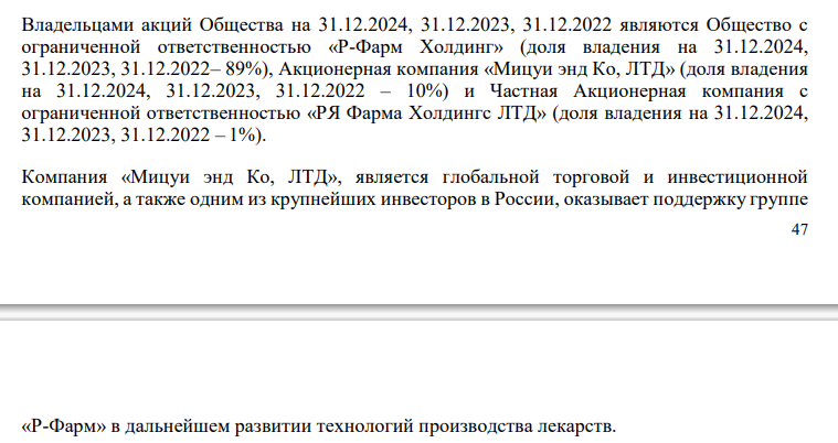 Само «Р-Фарм» в 2024 году ввело в состав акционеров, помимо Репика (через «Р-Фарм Холдинг»), японскую фирму «Мицуи энд Ко, ЛТД» и частную акционерную компанию с ограниченной ответственностью «РЯ Фарма Холдингс ЛТД» с Кипра.