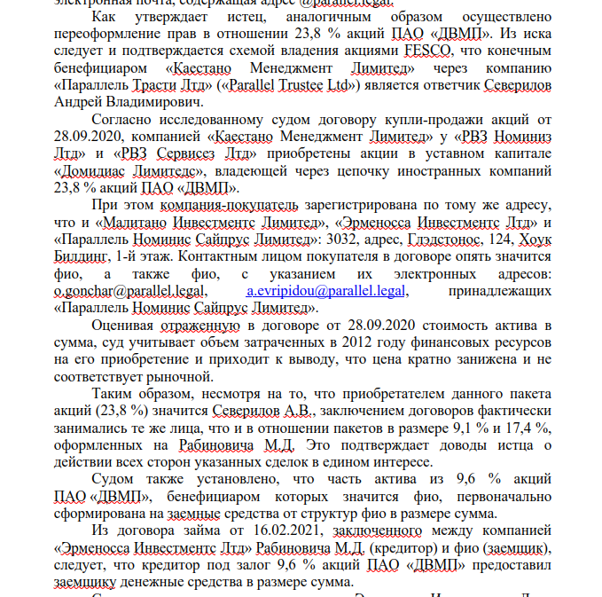 Но приходит 2023 год и по иску Генпрокуратуры Магомедовы, Северилов и Рабинович, точнее их многочисленные офшоры, лишаются своих акций в FESCO. В материалах суда прямо вскрывались офшорные цепочки, через которые Рабинович и Северилов прокручивали сделки. На момент иска эти двое владели 50,3% в FESCO.