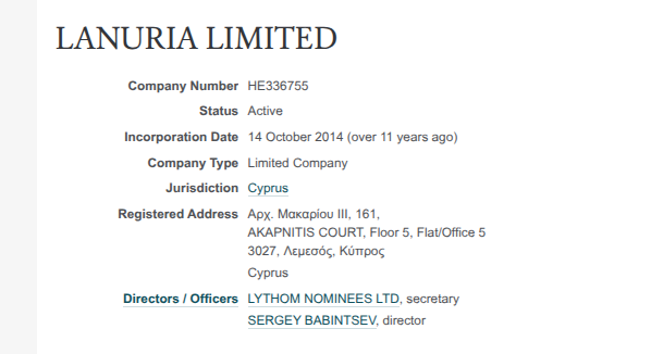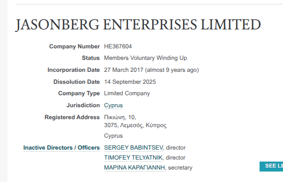 Но, если DELOPORTS LIMITED ликвидировали, то упомянутое выше Lanuria Ltd вполне себе действующее и управляется человеком с российской фамилией - неким SERGEY BABINTSEV. Этот человек, близкий к Шишкаревым: до сентября 2025 года (до ликвидации) JASONBERG ENTERPRISES LIMITED он был в числе руководителей, вместе с TIMOFEY TELYATNIK, коего и считают родней Шишкарева. Телятнику также было подконтрольно и URALITA INVESTMENTS LIMITED.