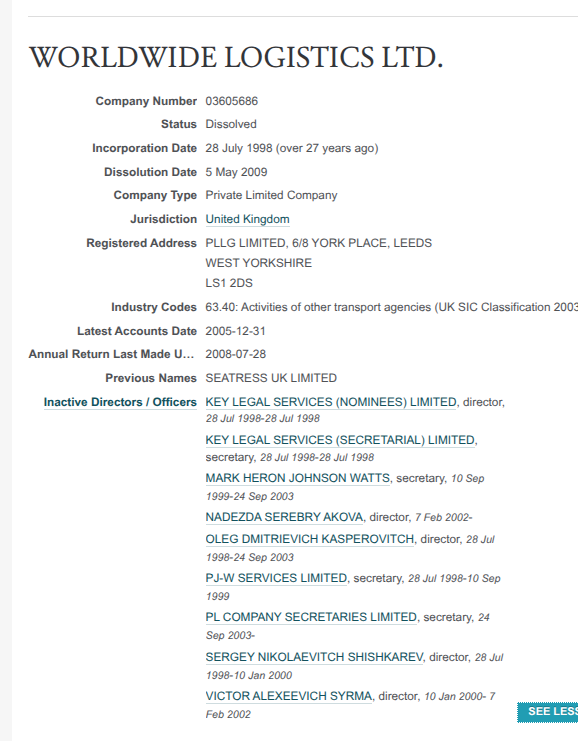 Что интересно, сам SERGEY NIKOLAEVITCH SHISHKAREV фигурировал как директор ныне ликвидированной британской фирмы - WORLDWIDE LOGISTICS LTD. В числе руководителей которой мы видим и VICTOR ALEXEEVICH SYRMA - полного тезку бывшего начальника новороссийской таможни, чьё назначение некогда мог пролоббировать отец Шишкарева. Кстати, Сырма после увольнения всплыл в структурах Сергея Шишкарева. Поговаривали, что и прочих силовиков отец с сыном лоббировали в кресла. Не зря же зам начальника УФСБ по Новороссийску Задимитченко потом всплыл в службе безопасности ГК Дело.