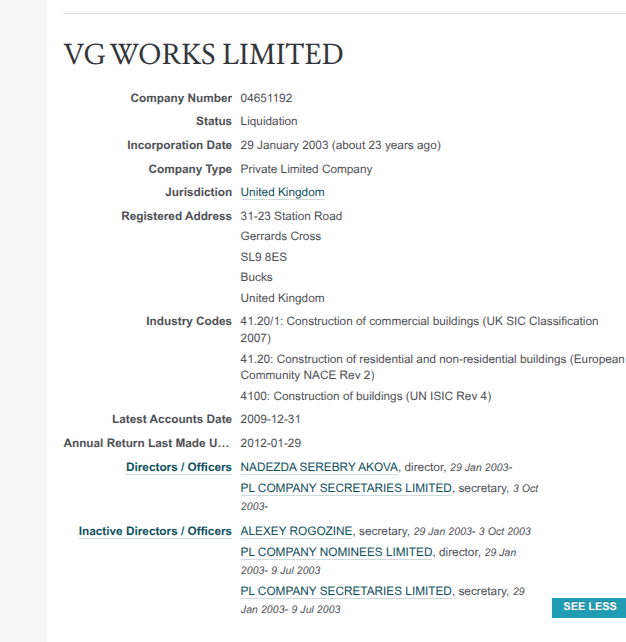 Но вернемся к бывшему британскому активу. Там мы видим некую NADEZDA SEREBRY AKOVA, через которую и британскую VG WORKS LIMITED Шишкарев связан с ALEXEY ROGOZINE или, если по-русски, Алексеем Рогозиным - тезкой сына бывшего вице-премьера правительства РФ, руководителя ГК «Роскосмос» Дмитрия Рогозина.