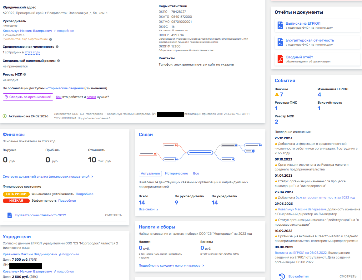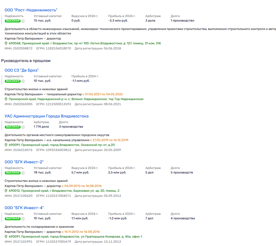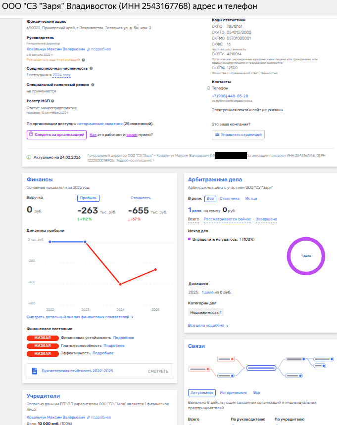 Итак, ООО СЗ «Заря» создано в 2022 году, имеет в штате одного сотрудника и убыток за 2024 год - 263 тыс. рублей. Владелец и директор - некий Максим Ковальчук, на которого оформлена целая пачка долей в строительных компаниях. Но, судя по фирме-ответчику, порой его компашки выполняют роль статиста, чья задача - получить муниципальную землю и потом отойти в сторону. Ведь за 2024 год все семь якобы строительных фирм, где наследил Ковальчук, принесли лишь убыток. При этом часть фирм входит в ГК «Д25», строящих ЖК Агат и ЖК Малахит во Владивостоке. Куда же делись деньжата?
