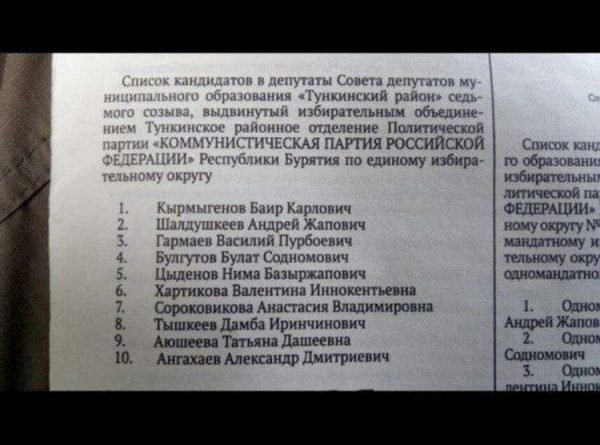 Но по списку в райсовет должен зайти Н.Б. Цыденов. Видимо, тункинский ТИК, райсовет, глава района Маншеев и местные единороссы в сговоре с местной КПРФ незаконно сговорились не допускать Ниму Базыровича в райсовет.