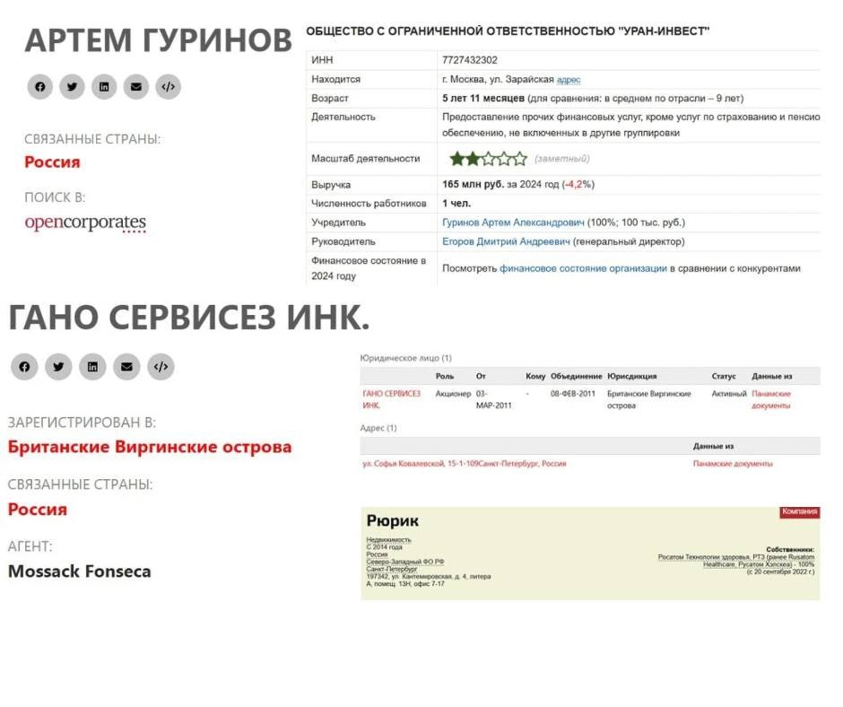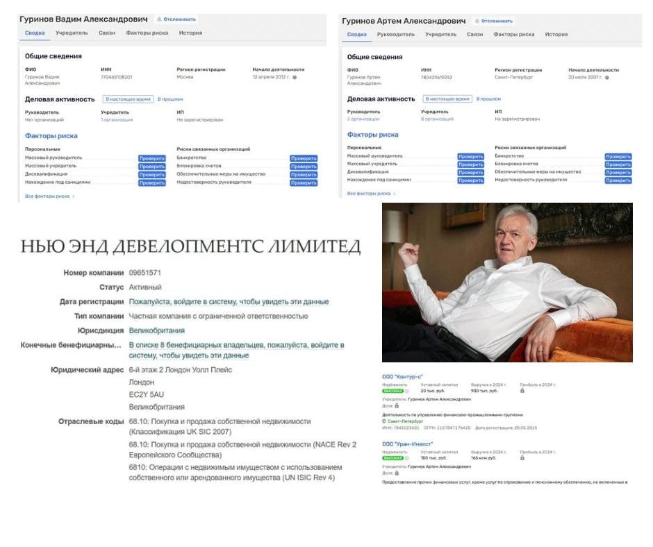 Ключевая фигура в семейной структуре — Галина Гуринова. На неё были оформлены значительные доли активов. В открытых источниках упоминается наличие у неё паспортов Белиза и Кипра, а также участие в иностранных компаниях.