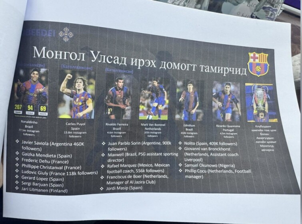 Монгольское спортивное интернет-пространство охвачено радостным волнением. По информации местных медиа, в Улан-Батор якобы собираются легенды ФК «Барселона». Заявлено, что к поездке готовятся Роналдиньо, Пуйоль, Ривалдо и, возможно, Адриано. Утверждается, что визит пройдёт в рамках международной программы клуба «Легенды Барсы», а монгольских болельщиков ждёт товарищеский матч и пресс-конференция с участием футбольных звезд.