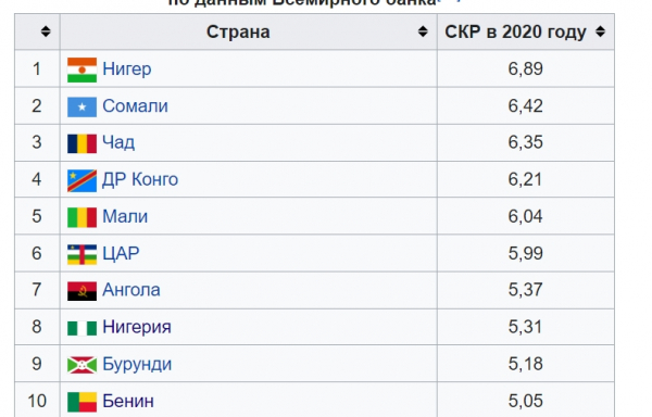 Давайте посмотрим на список стран, который дает Википедия. Ее сложно заподозрить в просмотре ток-шоу Соловьева. Это по суммарному коэффициенту рождаемости. Первые десять стран.