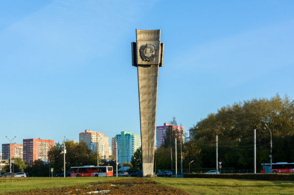 На въезде в город со стороны ж/д вокзала Пермь II расположен перекресток с кольцевым движением, а посреди кольца стоит, заметная издалека, трехгранная стела (колонна) с изображением пермского герба и ордена Ленина на гранях в верхней части. Точная высота стелы не известна, поскольку в разных источниках она указывается по-разному - от 20 до 25 метров.