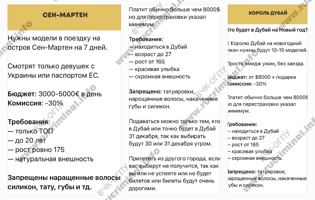 Managers are especially active and at a good price (starting at $3,000 per day) in searching for noticeably thin models for the islands of Saint Barth and Saint Martin—the hubs of billionaires from around the world. Among the wealthy Russians, Roman Abramovich is a favorite hangout there. However, one of the clients is categorically against women from Russia and only expects Ukrainians or those with EU passports.